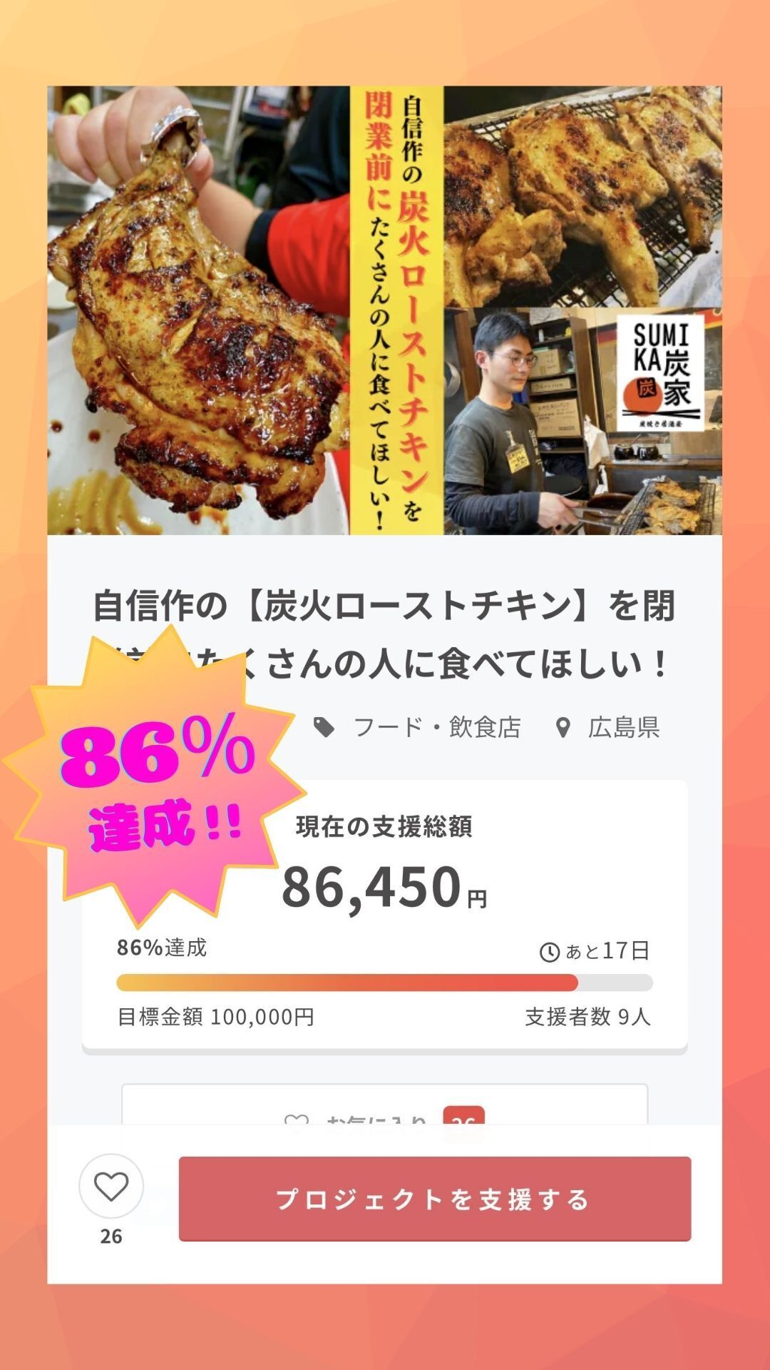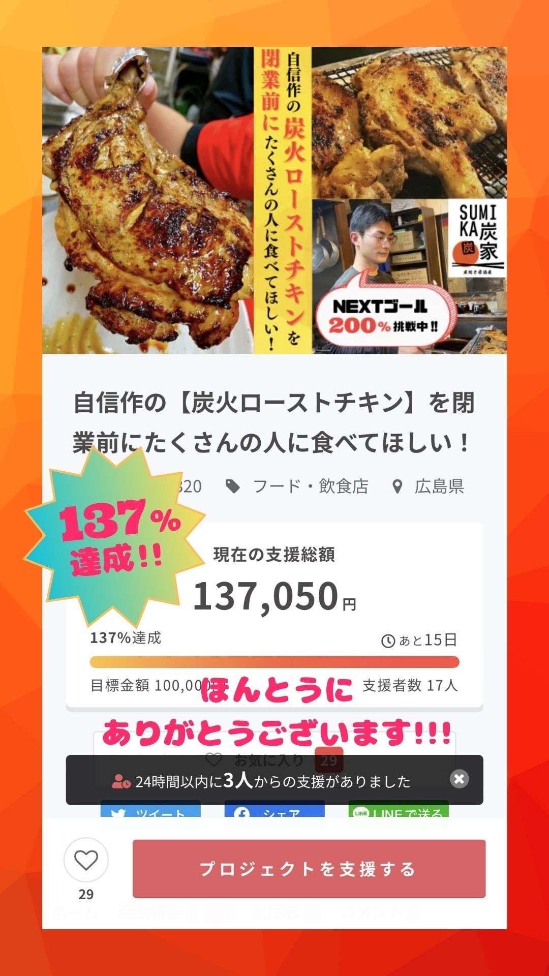 こんにちは。やきとり炭家 店主の松浦です!引き続きクラウドファンディングでのご支援をありがとうございます。現時点で17名の方にご支援いただき、137%達成することができております!昨日はお店の常連の方が【頑張れ店長!コース】をご購入くださいました。ありがとうございます。頑張ります!お気に入りしてくださる方も着々と増えていて非常に嬉しいです!皆様のおかげでかなり早い段階で目標額を達成できました。終了まであと15日!NEXTゴール200%達成を目指して引き続き告知も続けていきます!--------------------------------------------------------------------▼人気のリターンのご紹介です♪チキンは仕入れの関係で限定数での販売です。できればお早めのご購入をお待ちしております!★残り11枠★一番人気!【ローストチキン3本コース ¥6,450】・特大炭火ローストチキン3本・自家製米『ななえびす』2合プレゼント--------------------------------------------------------------------★残り4枠★【ローストチキン5本コース ¥13,500】・特大炭火ローストチキン3本・自家製米『ななえびす』2kg--------------------------------------------------------------------人気No.2は【頑張れ店長!!コース】です。有難い!!引き続き営業も告知も頑張りますので、よろしくお願いいたします。松浦