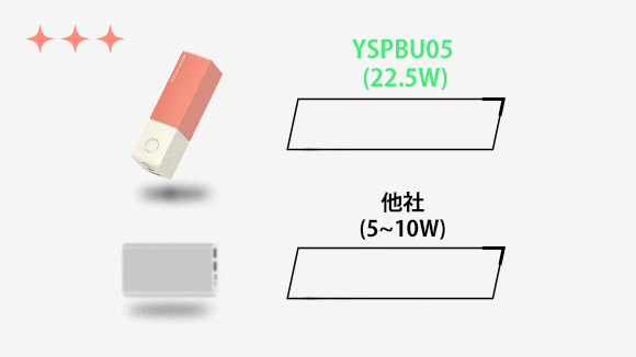 モバイルバッテリーは便利ですが、本体の充電に時間がかかるのが悩みどころ。一般的には、アダプターとケーブルを使って充電すると6~10時間かかる製品が多いです。YSPBU05は22.5W急速充電をサポートしておりますので、本体のフル充電にかかる時間はわずか1.5時間です。