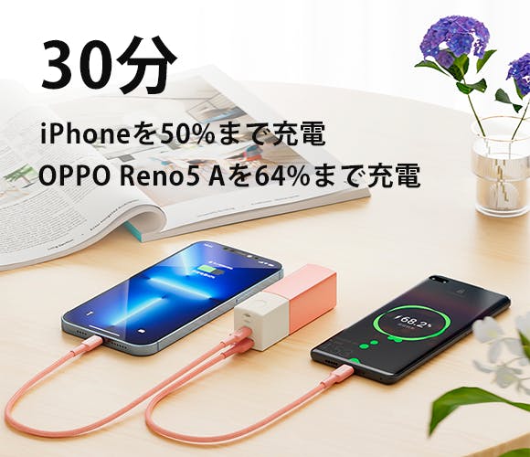 YSPBU05はUSB Type-AポートとType-Cポートで急速充電規格をサポートしており、同時に効率よく充電することができます。iPhone(PD 20W)なら30分で50%まで、OPPO Reno5 Aなら64%まで充電可能です。
