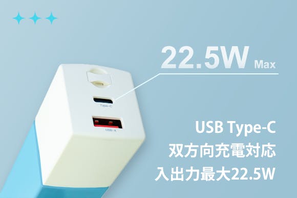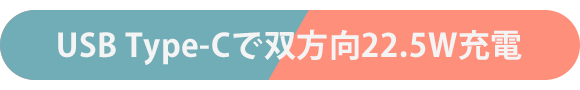 スマホをUSB Type-Cポートに接続して、最高22.5W出力で充電することができます。Type-Cポートは双方向充電に対応しており、最高22.5W入力で本体を1.5時間で充電することも可能です。
