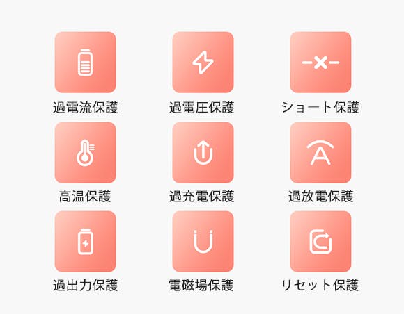 電気回路の多重保護機能を搭載しており、過充電や過放電のほか、高温やショートなどの異常から本体と接続したデバイスを守ります。