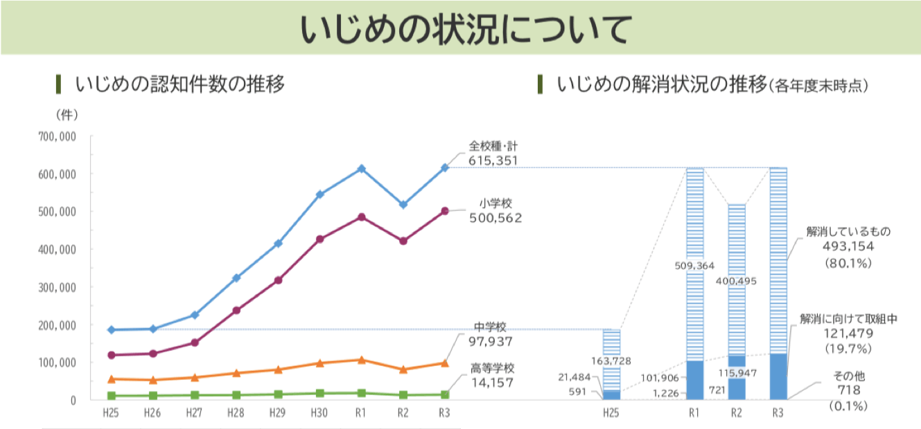 2022年の文部科学省の調査によれば、小・中・高等学校及び特別支援学校におけるいじめの認知件数は615,351件(前年度517,163件)であり、 前年度に比べ98,188件(19.0%)増加しています。