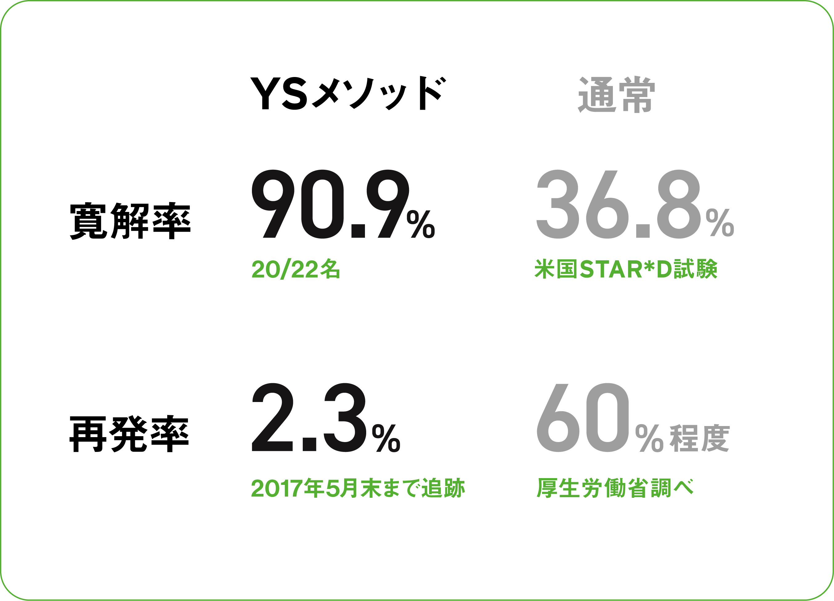 実際、この方法でうつ病患者の方々に臨床試験をしたところ、90日以内に90.9%が寛解、その後の再発率も2.3%というデータ結果が出たのです。(名前の頭文字をとって「YSメソッド」と名付けました)