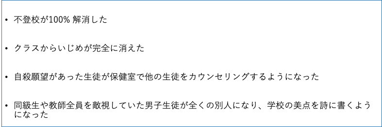 いじめにあっていた女子生徒と一緒に美点発見をやっていたら、途中で「私、もうみんな大好きになったから、先生、もう遊んで来ても良いですか?」と言って友達と遊びに行った、というエピソードもあります。