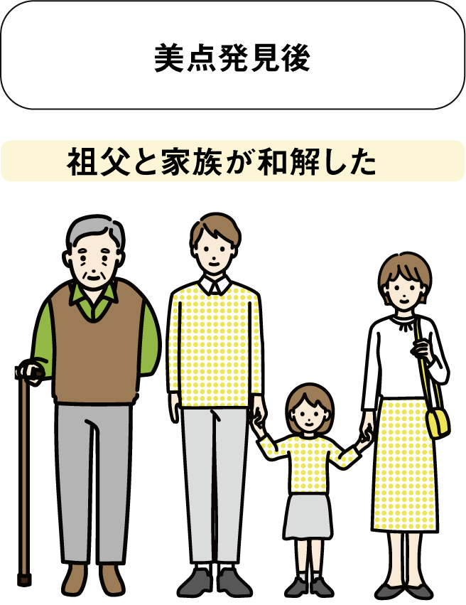 親からの愛を確信すると、真っ白だった頬に血色がはじめて戻った。恐怖がなくなり、絶えず苦しめられた過敏性大腸炎は回復。ほぼ食べれなかった食欲が戻り、体調が良くなる。中学では保健室登校で過ごすが、高校は自ら望んだ通信制の高校を卒業。今は自分自身も家族の美点発見をし続けている。