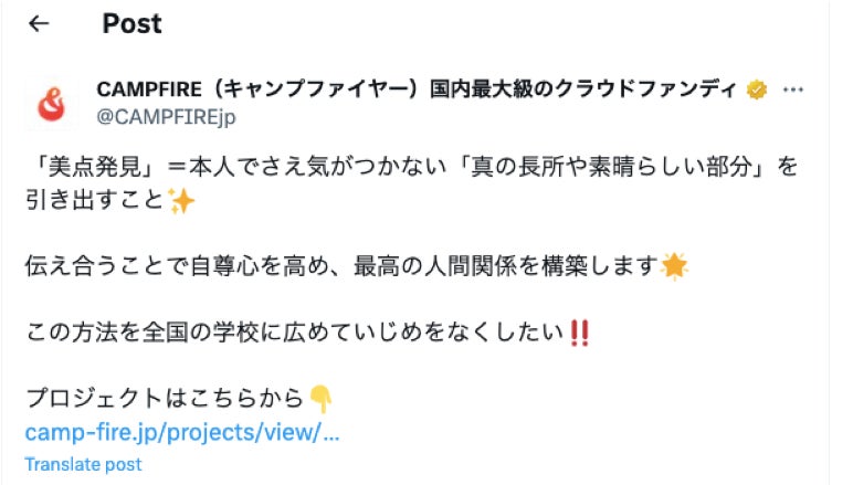 今回のクラウドファンディングの運営元であるCampfireさんが、公式のX(フォロワー数 約99,000人)で美点発見プロジェクトをツイートしてくれました!