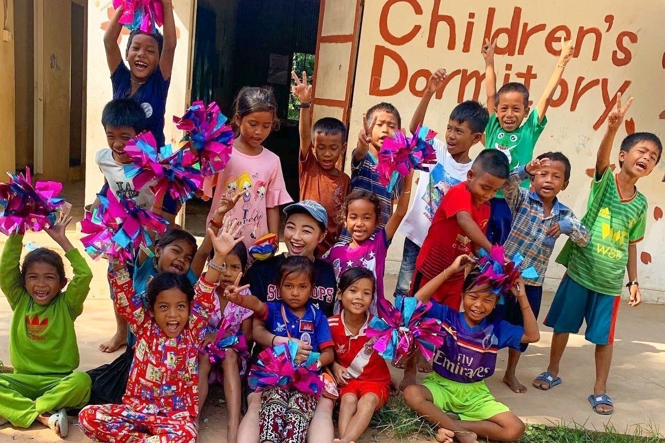 (オンラインでカンボジアにある孤児院に住む子どもたちにチアを教えています)