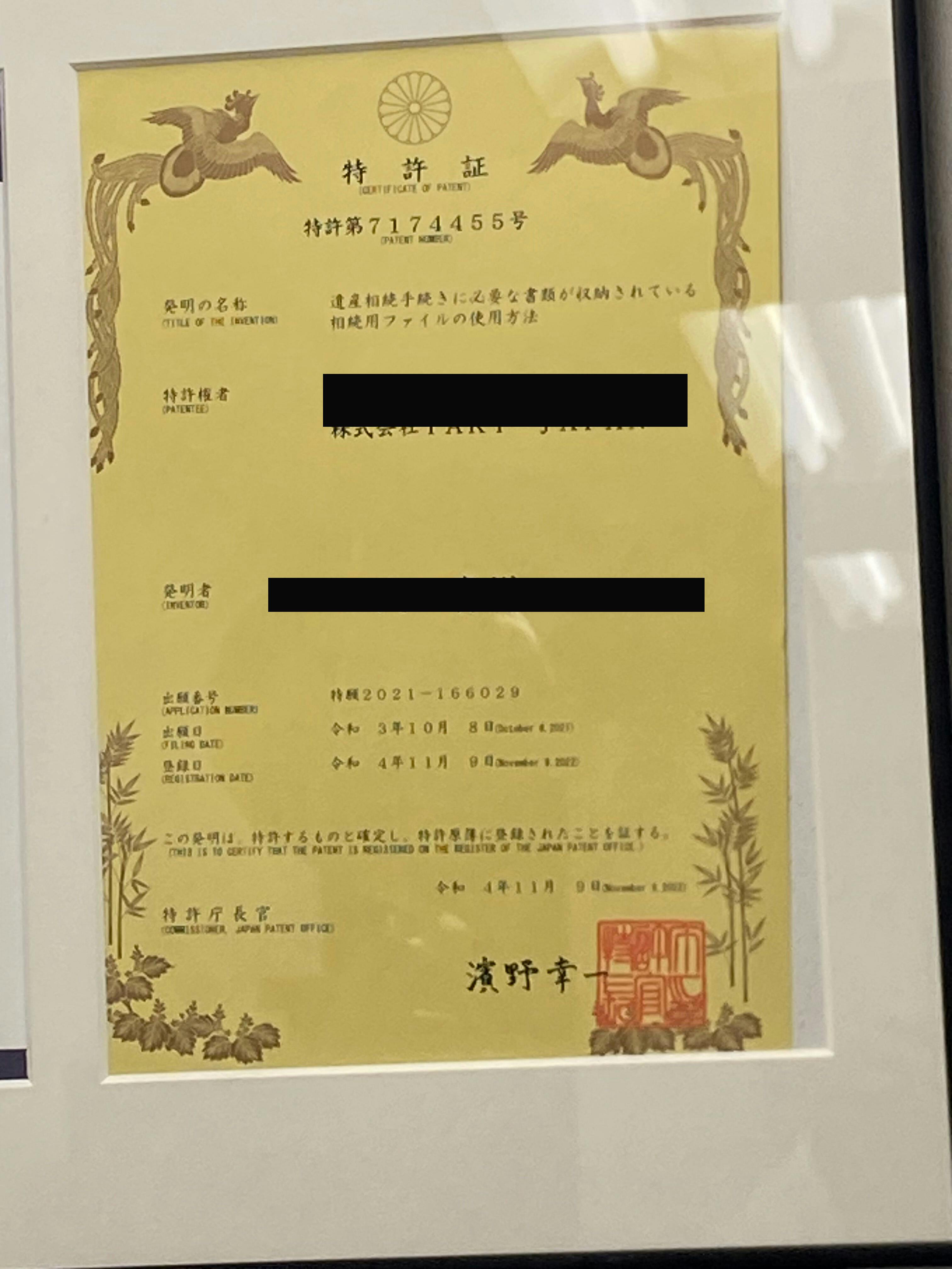この商品の相続ファイルについての使用方法についての特許は2021年に取得致しました。特許第7174455号