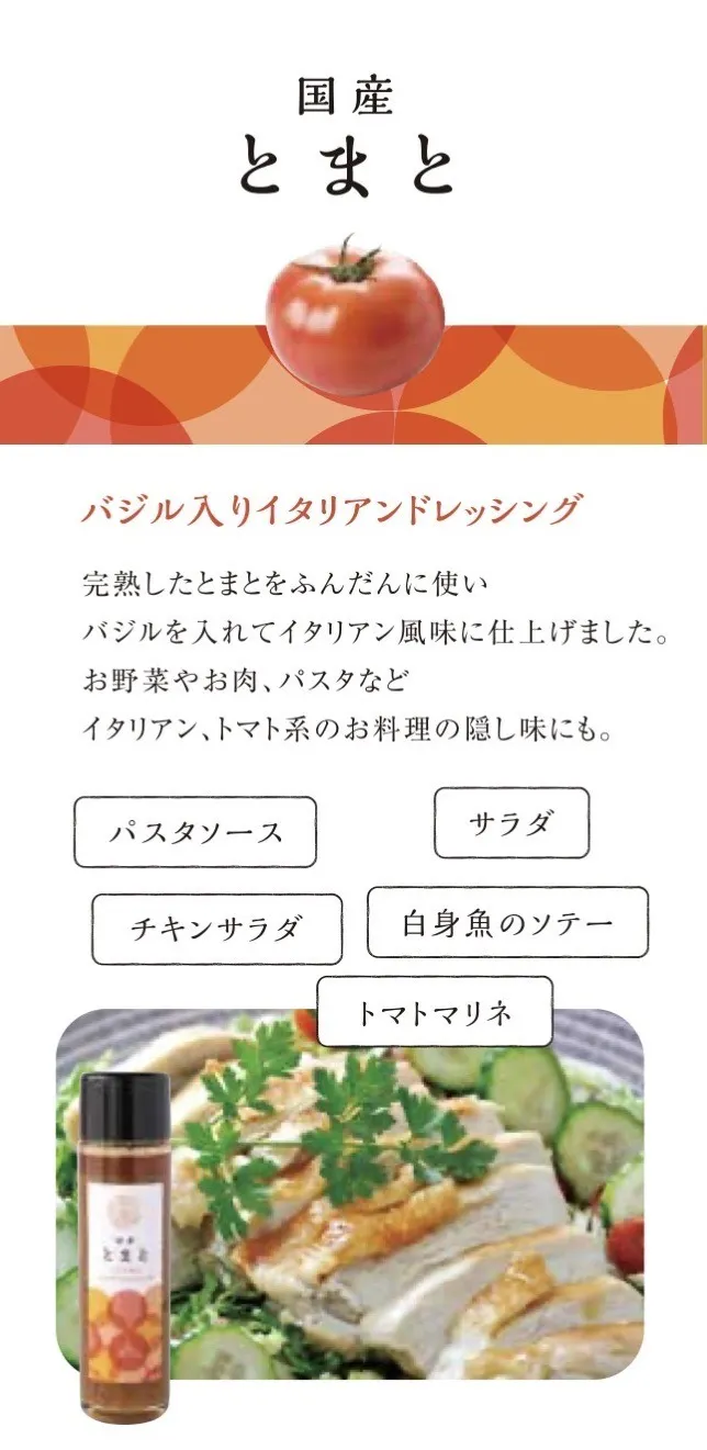 毎日の食卓で楽しんでいただきたく、ドレッシングとケチャップ、パスタソースのセットをご用意いたしました。野菜サラダにも野菜をプラスでき、また、お肉、お魚、お鍋などいろいろ料理に使えます。お好みに合わせてアレンジして楽しむのもおすすめです。