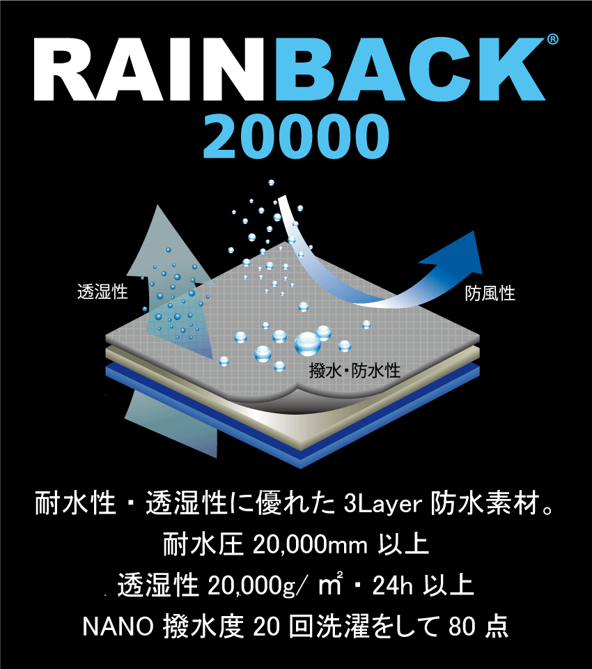 オリジナルの3層構造生地の【RAIN BACK】を使用。