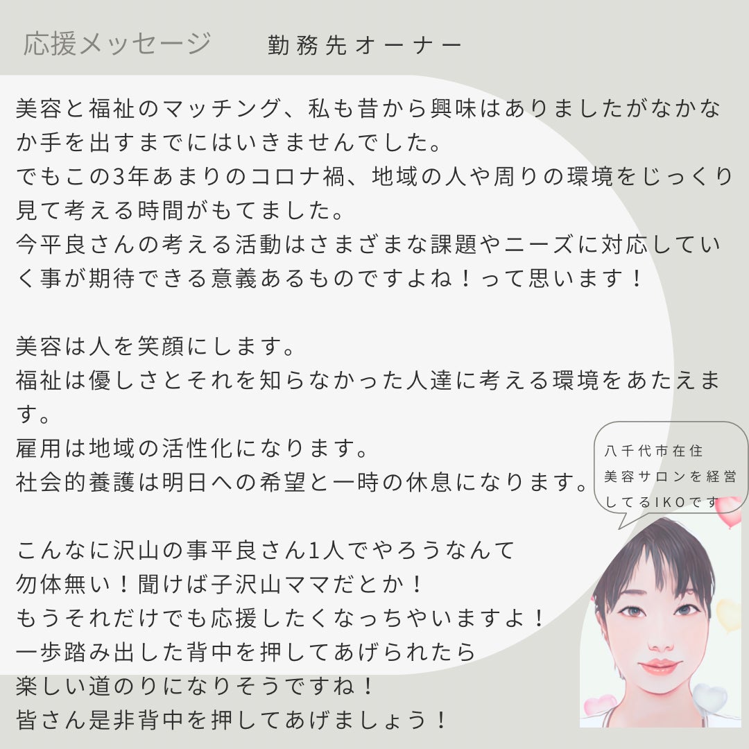 2023/05/30 11:38皆様こんにちは。高齢者や産後ママ、障害のある方をもっと笑顔に。美容と福祉のコミュニティ作ります!プロジェクトのmikko306こと平良です。本プロジェクトにご理解とご支援をくださり、本当にありがとうございます!本プロジェクトは、昨日5月29日をもちまして、終了いたしました。目標金額130万円には届きませんでしたが、39名の方から、総額482,500円のご支援をいただくことができましたので、ご報告させていただきます。皆様のご支援、ご協力によりプロジェクトがここまで来ましたこと、心から感謝申し上げます。※詳細はこちらからご覧いただけます。https://camp-fire.jp/projects/view/656574?utm_source=line&utm_medium=social&utm_campaign=line_po_share_c_msg_projects_showご支援と共に頂いた皆さまからのメッセージ。とても嬉しく、これから先も大切に心に留めながら活動をしていきたいと思います。お手伝いが必要な人に喜んでもらえる事は何か。と模索し、美容と福祉を繋げようと仕事を始めてから5年。まだまだやりたい事がまとまってなかったり、実現に向けて多くの手順を踏まなければならない事もありますが、その先にある笑顔の為にただただ頑張っていきたいと思います。皆さまの周りで、私がお手伝い出来そうな事があれば是非ご連絡下さい。少しでも多くの方のお役に立てれば本当に嬉しいです。沢山のご支援本当にありがとうございました! もっと見る