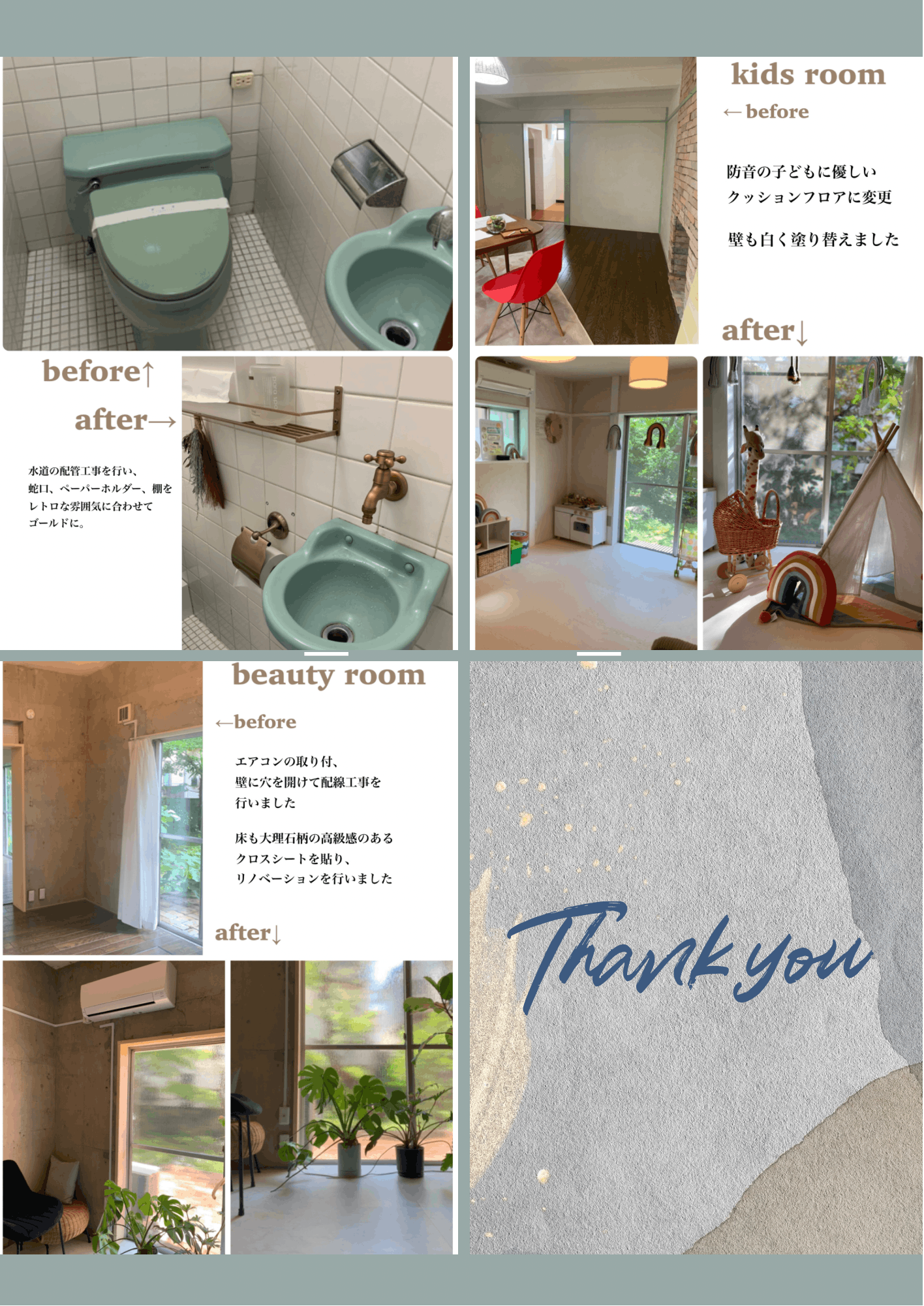2023/05/18 12:00こんにちは!ma maniereです!この度は私たちのクラウドファンディングへの温かいご支援、ご協力誠にありがとうございました。おかげさまで4月より予定していた・トイレなど水回りのの配管工事・トイレのリノベーション・玄関床のリノベーション・キッズルームの床、壁のリノベーション・ビューティールームの床のリノベーション・ビューティールームのエアコンの配線工事・エアコンの取り付け工事をスタート致しました。アンティーク感のある温かい雰囲気を残しつつ、安全面を考慮して床を張り替えたり、エアコンを取り付けたり、業者の方と相談しながら自分たちの手でもできることをお手伝いさせて頂きました。まさに支援してくださった方々、そしてメンバーみんなで作る温かいサロンが完成しました。キッズルームは海外の子供部屋のような、虹や太陽をモチーフに温かく元気が出るようなお部屋にビューティールームは女性が日常から離れ、自分自身を大切にできる特別感のある空間にそんなことを意識しながら作り上げたそれぞれのお部屋ですメンバーたちの想いが詰まったサロンそして皆様の温かいお気持ちによって作られた環境この場所がこれから沢山の人々を笑顔にするような特別な場所になるようメンバー全員で気持ちを一つに頑張っていきたいと思います!本当にありがとうございました!ma maniere もっと見る