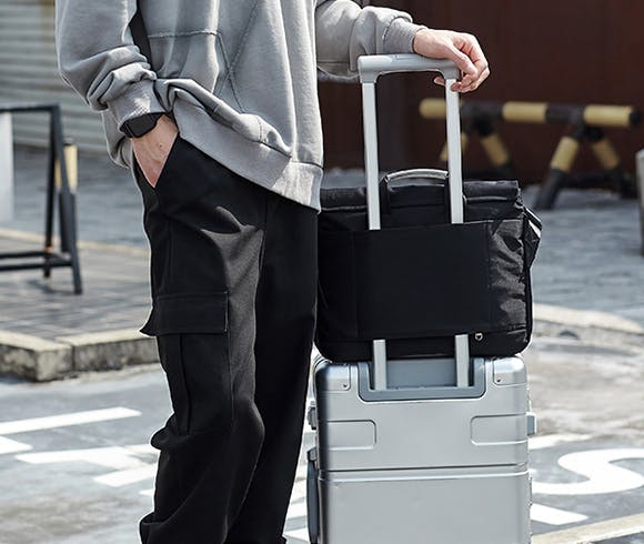 背面隠しポケットのジッパーを開ければスーツケースのハンドルに取り付けることもできますので、旅行や出張などの場合に活用できます。
