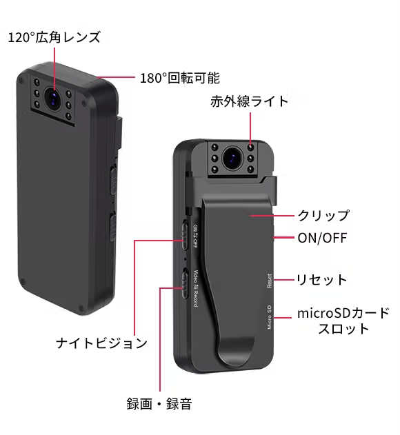 ・手のひらサイズかつわずか64g超軽量設計、便利なクリップも搭載! ・1800mAh大容量バッテリー内蔵!フルHDで最大18h録画可能! ・赤外線ライトを6つ搭載しており、夜でもくっきりと記録可能! ・120°超広角&180°回転可能なレンズ・手ぶれ補正搭載!