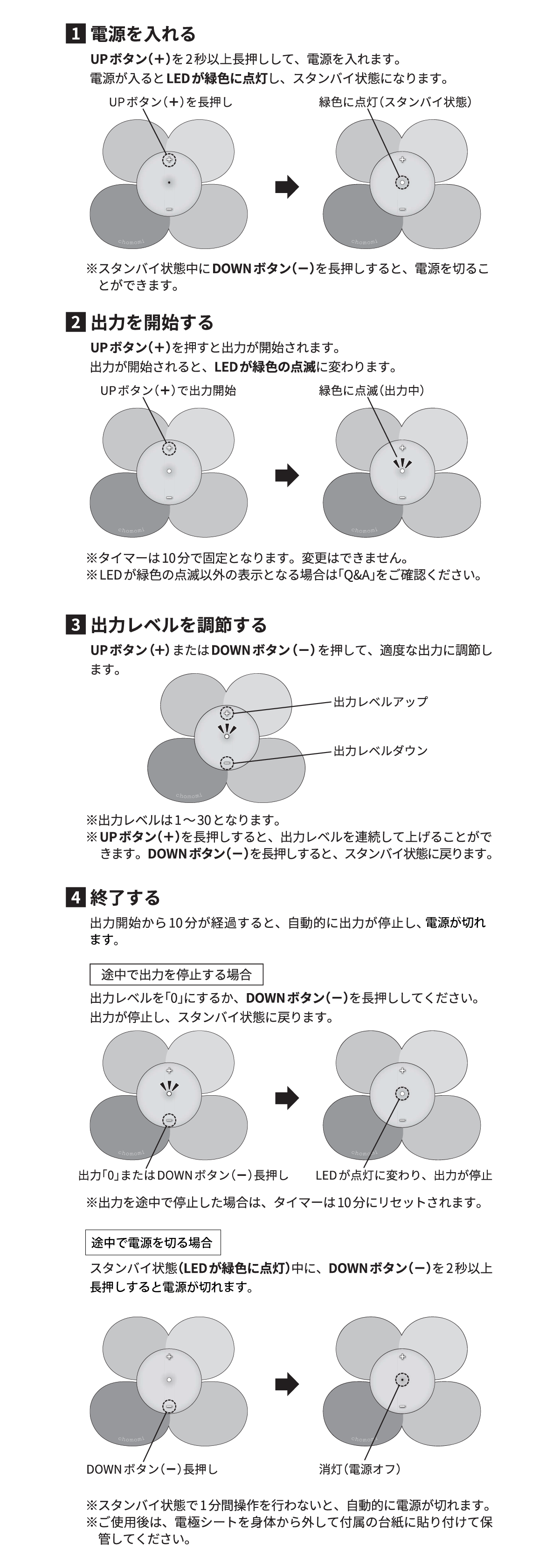 ・chomomiの使い方(電極シートをセットしてから操作を行ってください)