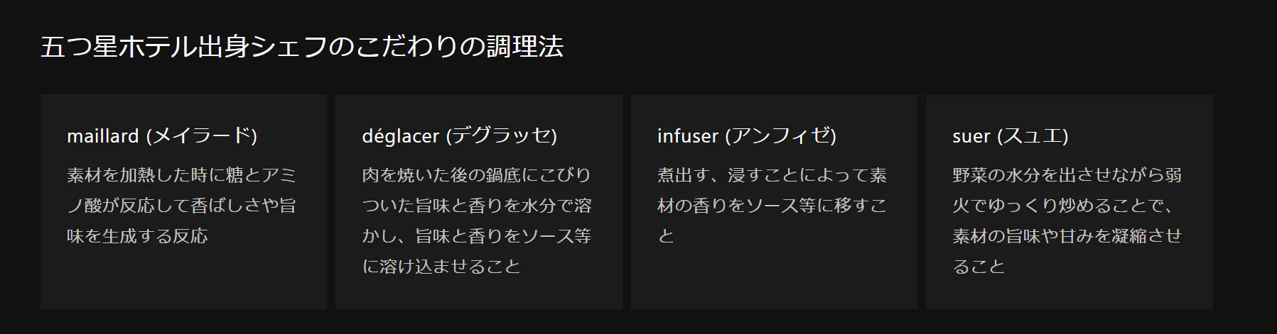 進化した東大カレーは、5つ星ホテルのフレンチレストランで10年以上の経験を積んだシェフが、食材選びからこだわって調理しています。一つ一つ手間を惜しまず手作りしているからこそ、安心でき毎日食べても飽きがこない味わいに仕上がりました。シェフの手作りだからこそ、食材ごとにフレンチの技法がふんだんに使われています。