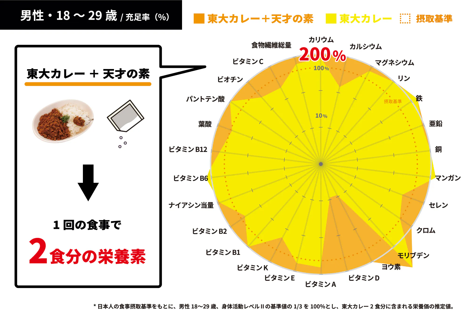 ・1日に必要な栄養価の3分の2(2食分)を「東大カレー&天才の素」1食でバランスよく摂取することができる