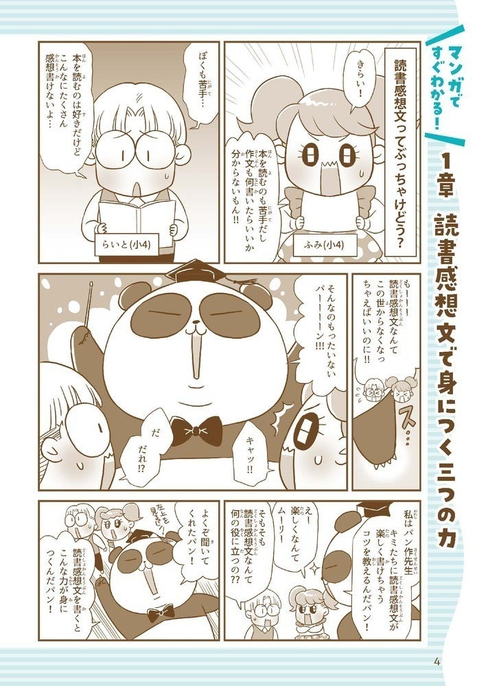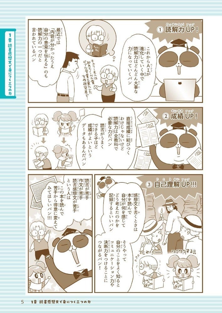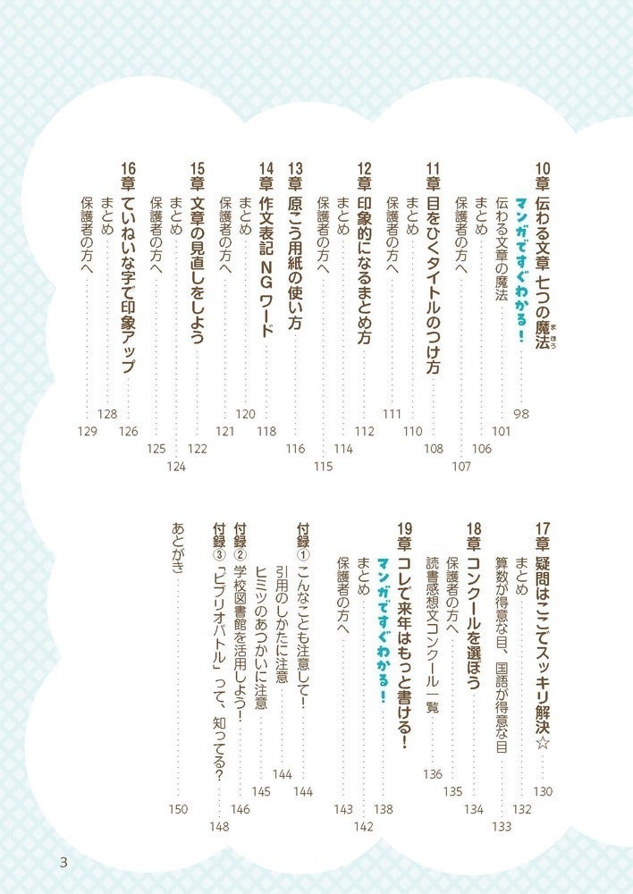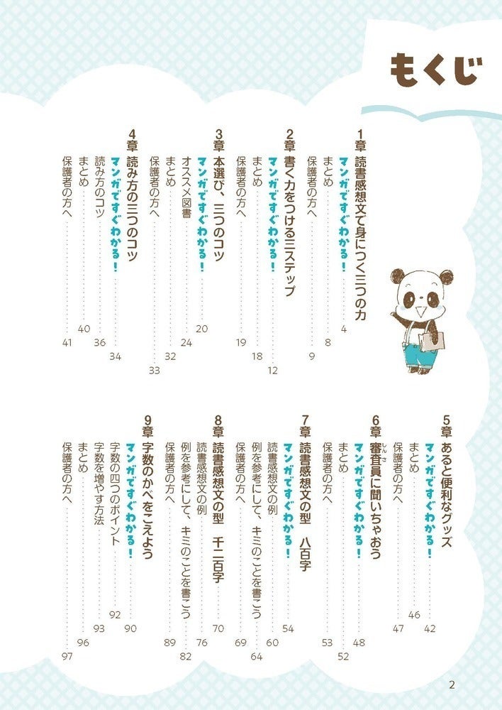 見開きでマンガを取り入れ、お子さまが「自分で読んで、ひとりで読書感想文が書ける」ことが可能になる構成です。また、それだけではなく、親御さんにぜひ伝えたいことを記したパートもほぼ全ての章に入れました。