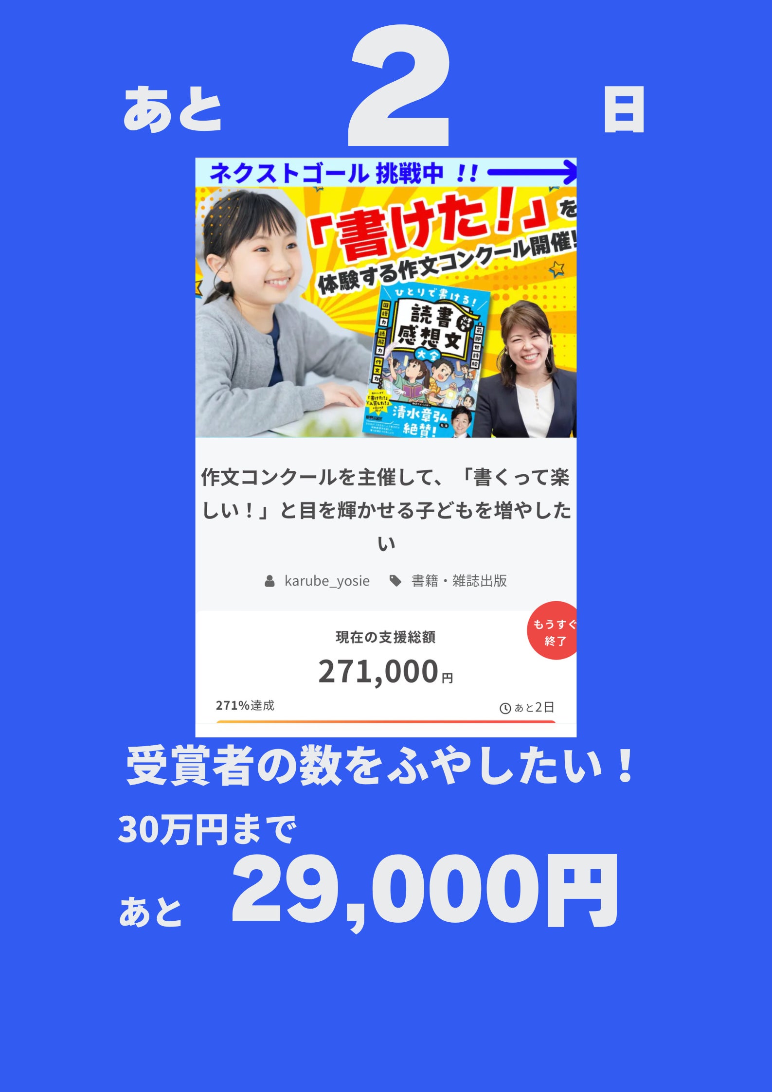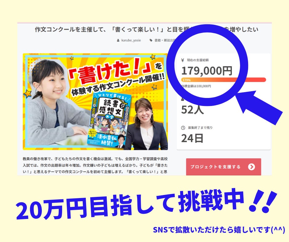 2023/03/22 05:00【支援の御礼】作文コンクールを主催して、「書くって楽しい!」と目を輝かせる子どもを増やしたいプロジェクトを応援してくださりありがとうございます。たくさんの方にシェア、支援いただき、2日で20%支援という目標を大幅に上回り、開始3.5hで達成。開始4日で179%達成。と自分でも驚くほどの支援をいただき、本当に感謝の気持ちでいっぱいです。現在は、作文コンクール参加者に届ける賞状をB5▶A4サイズにすべく200%達成に向け邁進中です。【追加リターンを作成しました】オンラインサロン(edu-salon)を運営し中学受験の長男を最難関校合格に導き『読書感想文大全』はAMAZON で学習参考書・語学カテゴリTOP、PTA業務と卒業対策委員をしながらクラファンを達成。私は起業5年目。その前は専業主婦。ちょっと、話がうますぎると思いませんか?クラファン開始3.5hで達成には実は、カラクリがあるのです。それは、CAMPFIRE公式パートナーである栗原麻由子さんの的確なアドバイス!「私もクラファン、しようと思ってるの。落ち着いたら、話聞かせて!」とお話頂くことも、今回非常に多く、クラウドファンディングの人気っぷりに驚きました。クラファンは、クラウドファンディングを始める前プロジェクトを創る時プロジェクト開始後においてやるべきこと手を抜いていいことやっておいた方がいいことがそれぞれ違います!プロジェクト型のクラファンは、あなた自身が商品という、ある意味、残酷なシステム。丸腰で挑戦し、敗退していくプロジェクトを私は、何度も何度も目の当たりにしてきました。私と繋がっている方はそんなプロジェクトをしてほしくない!そう思い、私のプロジェクトを半年以上に渡り支え続けてくださったCAMPFIRE公式パートナー栗原麻由子さんをお招きしてZOOM会を開きます。くりまゆさんは国際行政書士の秘書もされるほど、デキるお方。でも、伝え方がソフトで必ず相手をやる気にさせる超サポート上手。何度も何度も私に救いの手を差し伸べmessenger内で「くりまゆさん、女神!」と何度、叫んだことか。そんな素敵なくりまゆさんに出会ってもらいたい一心で追加リターンを作りました。CAMPFIRE公式パートナーと直に話せる機会ってそうそうありません。なぜなら、クラファンのサポートで忙しいから。直近でクラファンをするつもりはないけど、裏側で、私が何を頑張っていたか、熱量高く話すのを聞きたい方もどうぞ❤この追加リターンは2023年最強開運日である3月21日に公開されました。クラファンを成功させたい!と思っている方に最強開運日のパワーも届きますように★私はクラファンのシェア人数に目標を立てています。その数、50人。現在14人。まだまだその数は足りません。私は今日も10時からPTA役員として会議に出席します。このプロジェクトは教員の働き改革が進む中作文を書く機会が減った今、「書くって楽しい!」と目を輝かせる子どもを増やしたいという想いで作ったプロジェクトです。子どもたちのためにできることは何でもしたい!そんな私の想いに共感頂けましたらシェアや支援で力を貸していただけたら嬉しいです。よろしくお願い致します。 もっと見る