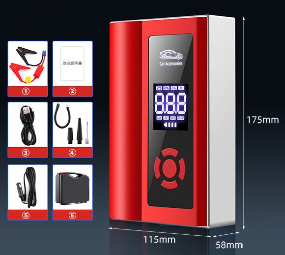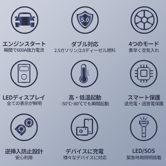 ジャンプスターターは12V/2.5L以内のガソリン車や12V/2.0L以内のディーゼル車に対応しております。また、3種類のノズルが付属して、自動車、バイク、自転車やボールなど様々なシーンで大活躍します!
