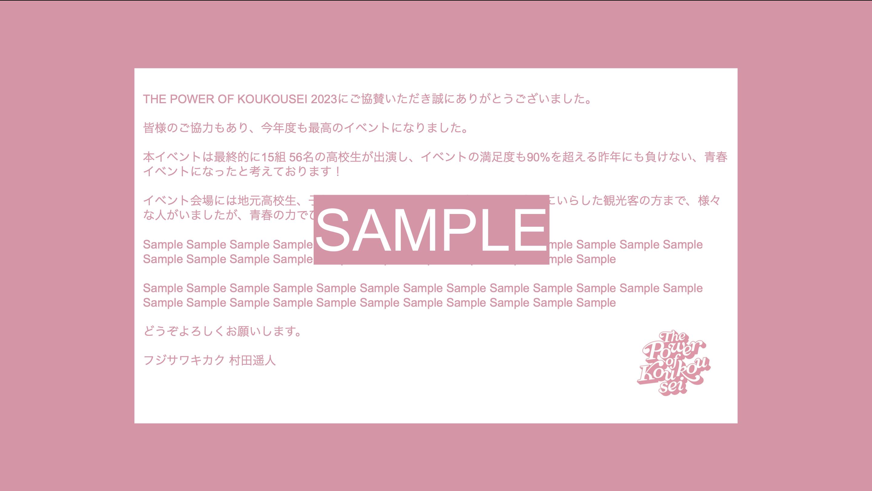 昨年コロナ禍で漏れた高校生の声をきっかけにこのイベントを初開催し、沢山の高校生のパワーをステージの上で感じることができました。真剣な眼差しと、そこから溢れ出るたくさんの笑顔が見れた最高のイベントとなりました。コロナ禍でもあれだけ彼ら彼女らは江の島で楽しむことができた。誤解を選ばずに言うと、コロナじゃなかったらあんな真剣な眼差しと笑顔が見れなかった。最悪なコロナがきっかけで生まれた最高のイベント。この街の高校生じゃなかったら、この街のステージじゃなかったらきっと生まれなかったイベント。この街の青春の力が詰まった『THE POWER OF KOUKOUSEI』を、誰もが毎年この時期になるとワクワクするような藤沢市の文化にするためにお力添えいただけたら幸いです。