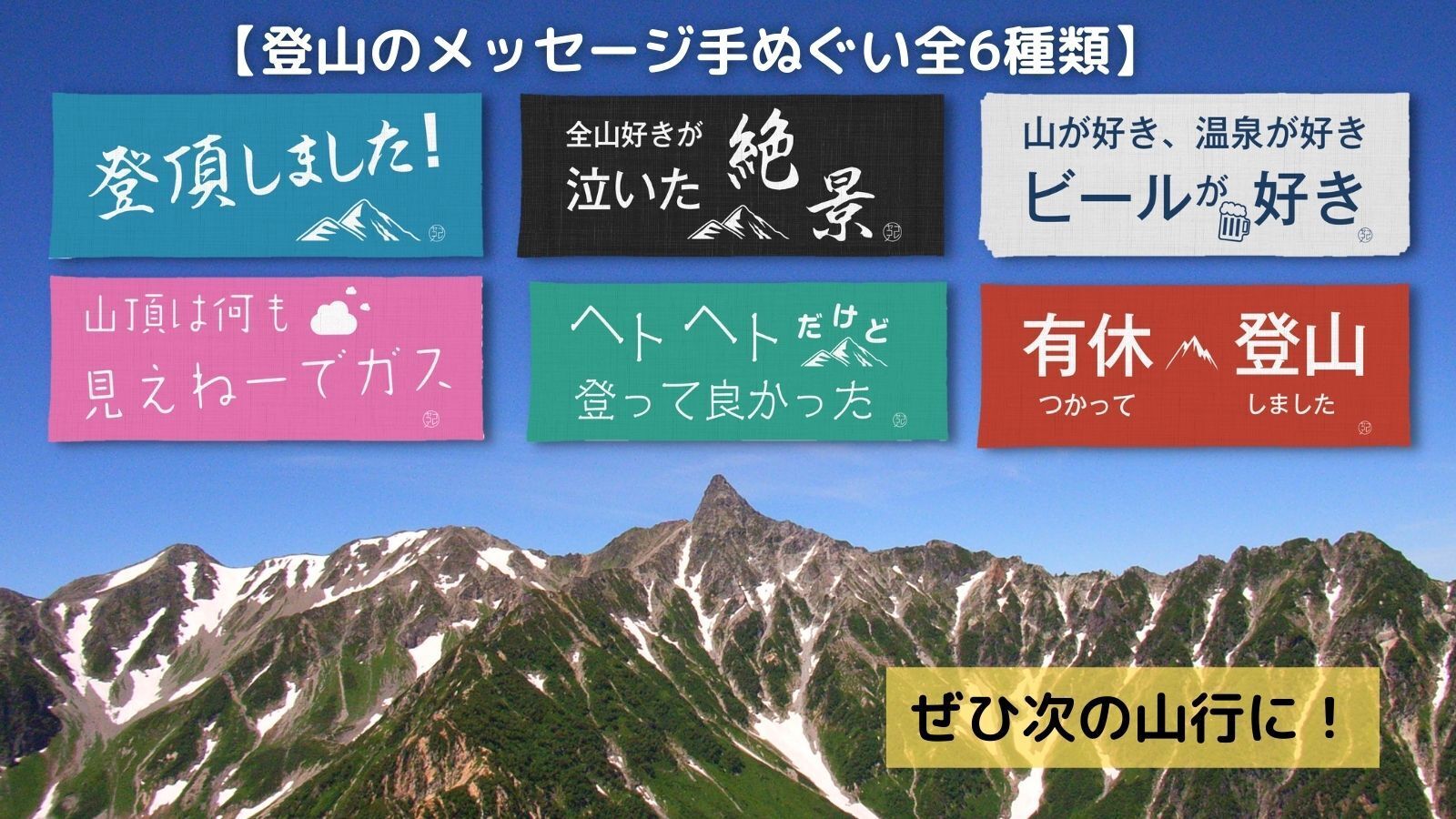 それでは、登山のよろこびや苦労の思いを込めた、6種類のメッセージ手ぬぐいをご紹介してまいります。
