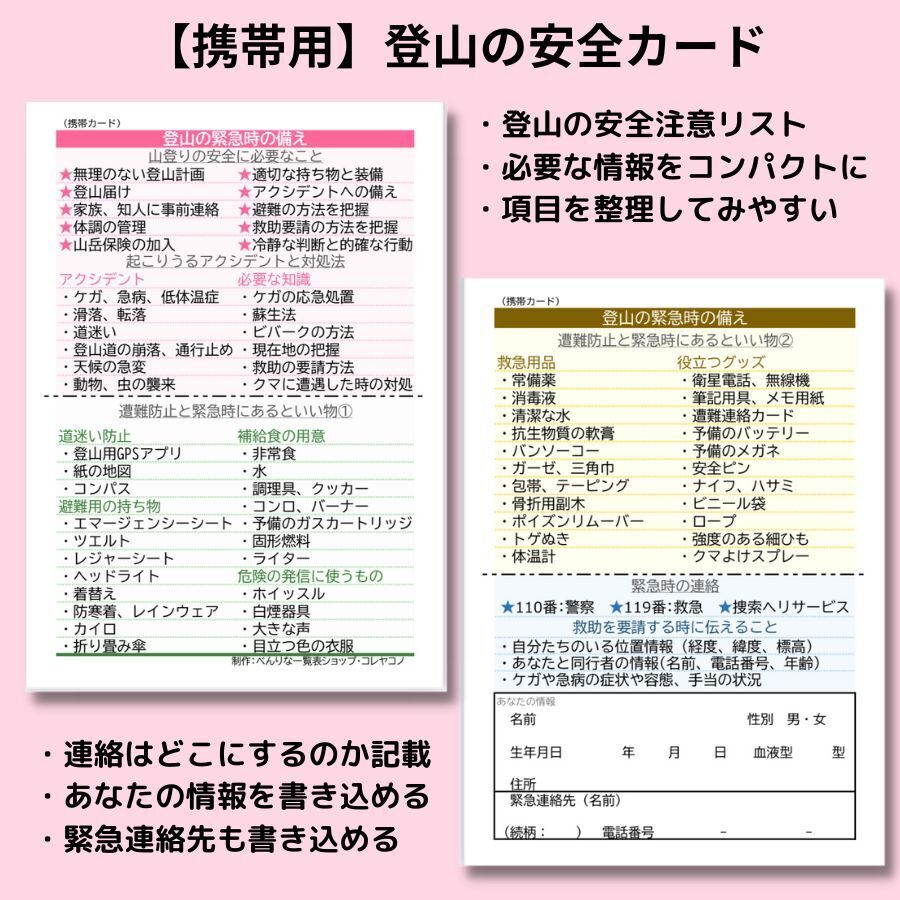 ・内容 【携帯カード】登山の緊急時の備え/緊急時の連絡先メモ