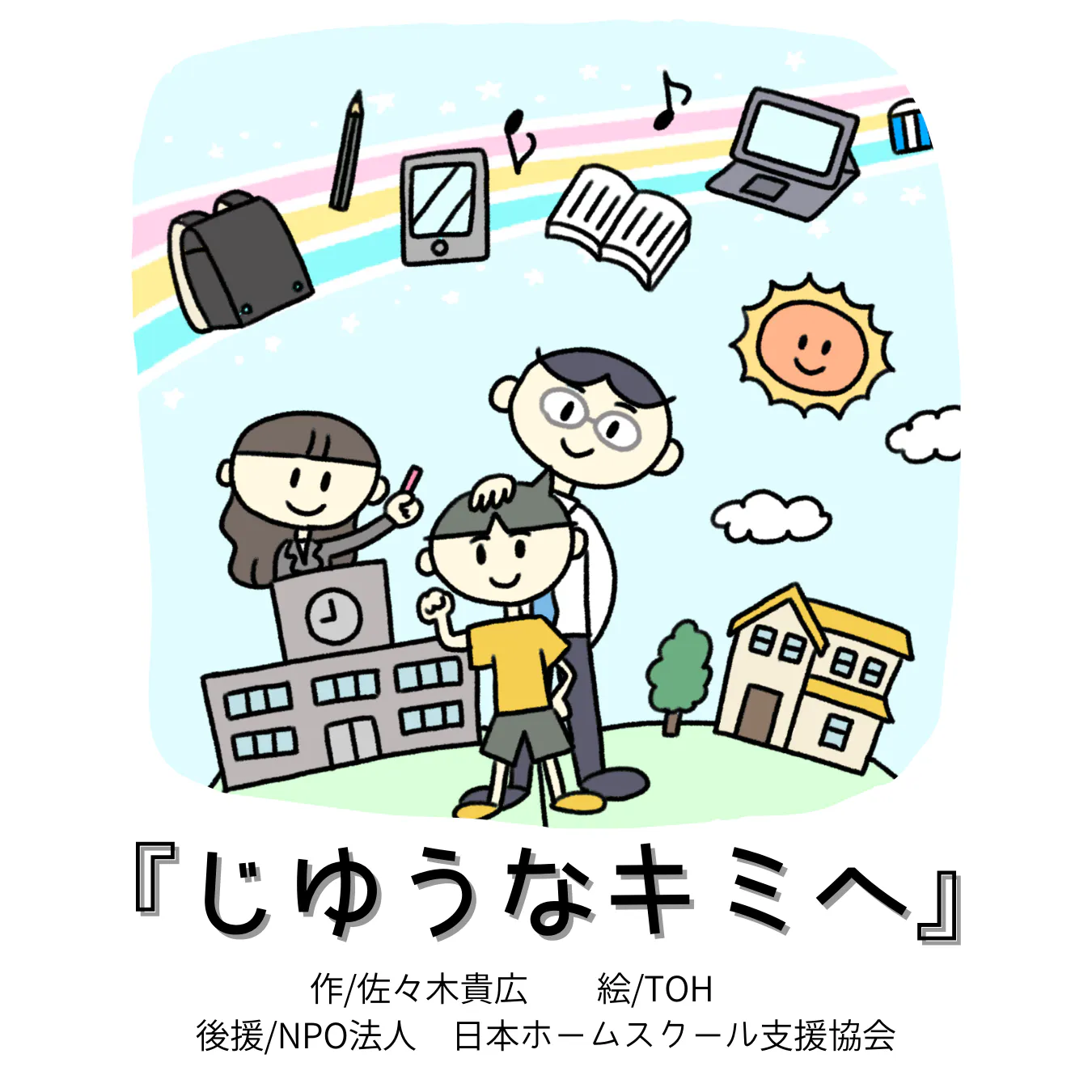 「じゆうなキミへ」というタイトルで、家庭で学習をする子どもとお父さんの会話から生まれたホームスクールの紹介絵本です。