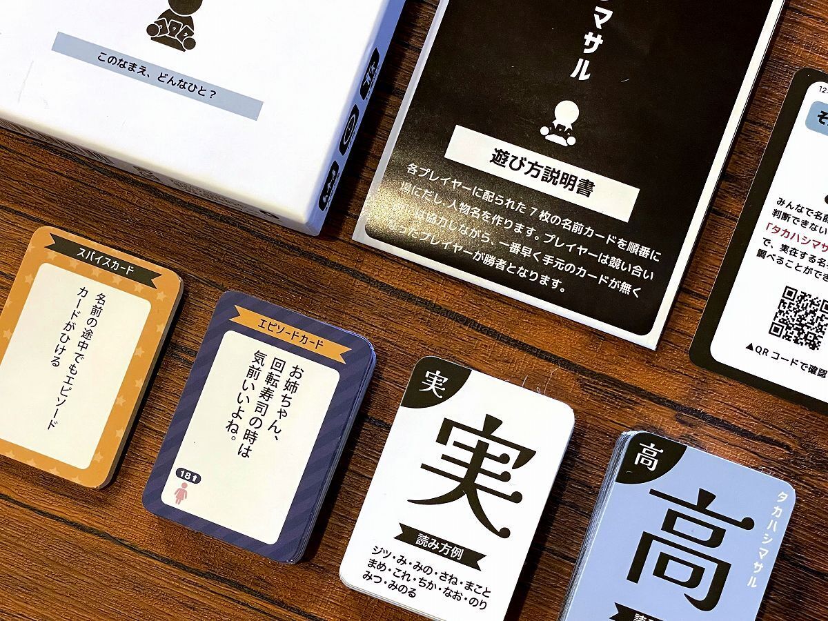 プレイヤーに配られるカードには、名前カードのほかにゲームを有利にすすめるための「スパイスカード」や「エピソード」があり、ゲームを際限なく盛り上げます。また、実在する名字かを調べるには「審議カード」のQRコードをスマートフォンで読みとり審議するなど、アナログゲームとデジタルの優れたところを融合しています。