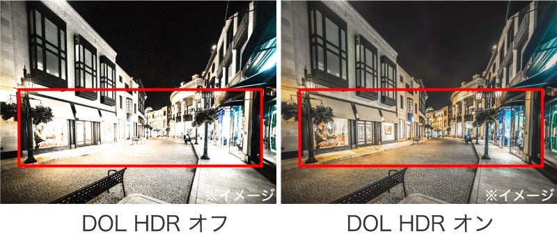 上記画像で赤く囲った部分で、DOL HDRオフの場合は明るいところが白飛びしてしまい鮮明さに欠けます。対してDOL HDRオンの場合は暗い部分と明るい部分が平均化されクリアなディテールが確認できます。