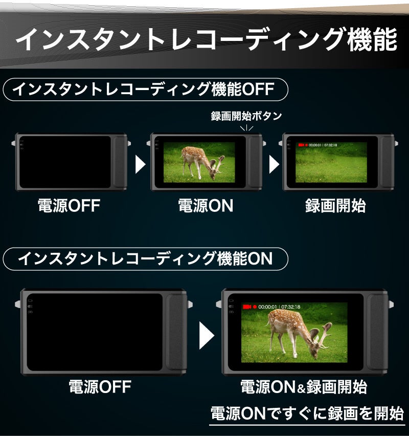 インスタントレコーディング機能をアクティブにした状態で電源をOFFにしておくと、次に電源をONにしたい際に録画ボタンを押さなくてもカメラに電源が入った瞬間から自動的に録画を開始します。