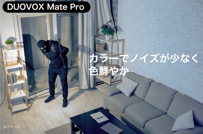 DUOVOX Mate Proは暗闇でもハッキリと映し出すことができる特殊なセンサーを使用しているため、一般的な監視カメラに比べ圧倒的なディテールを色合いまで鮮やかに残すことができます。