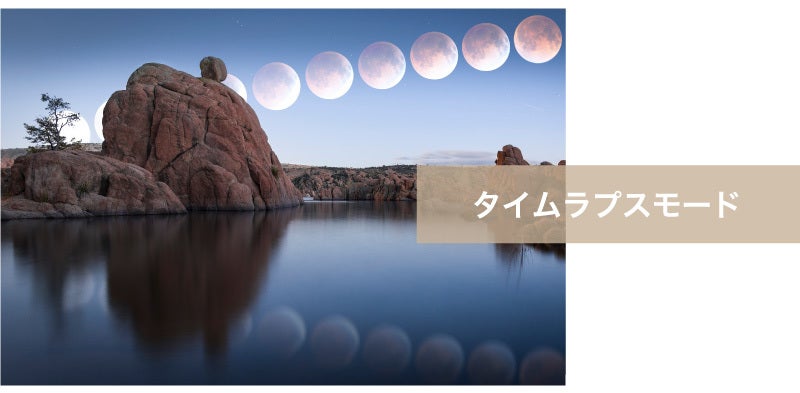 時間間隔(2秒、5秒、10秒、30秒、60秒)を設定し、夜間の長いタイムラプス撮影を可能にします。