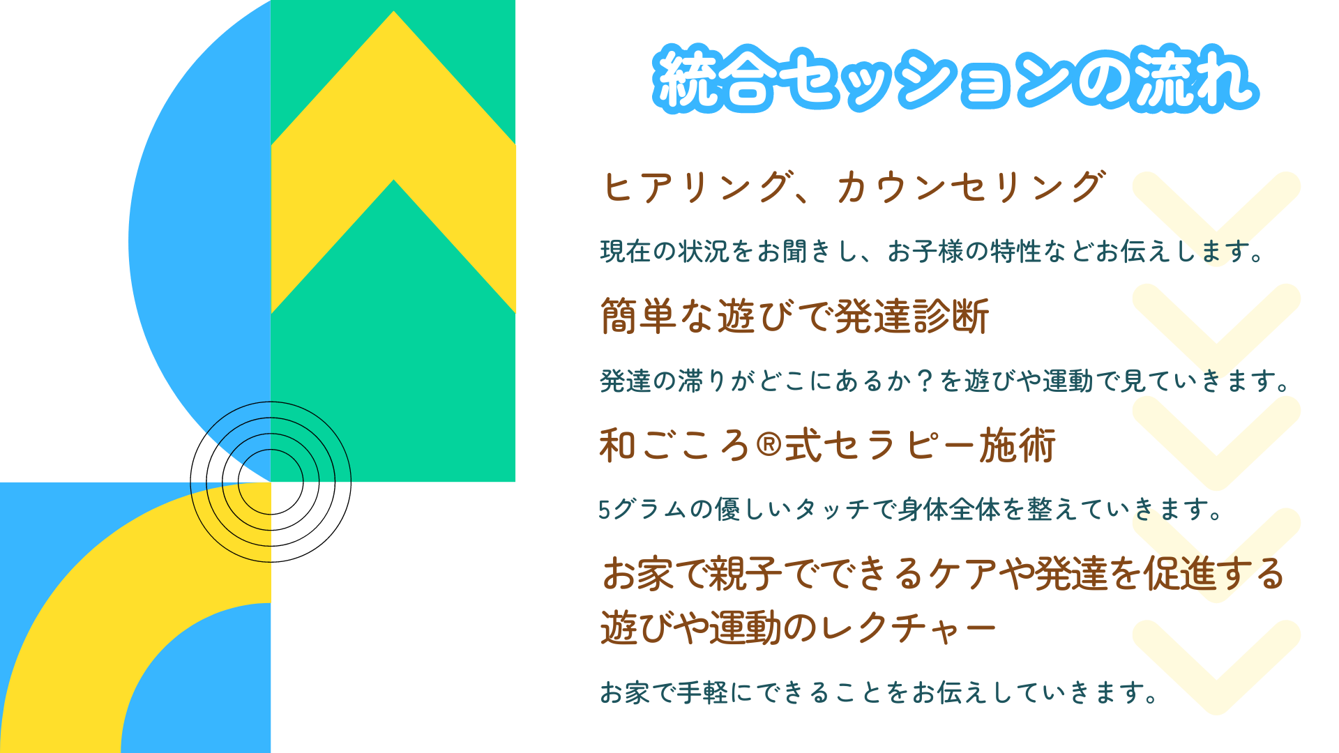 統合セッションは、僕がこれまで学んで習得してきたメソッドを組み合わせて、子どもたち1人1人の発達や抱えている問題に合わせたオーダーメイドのセッションです。