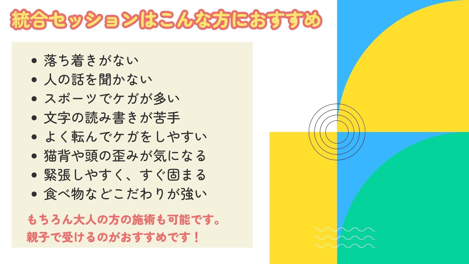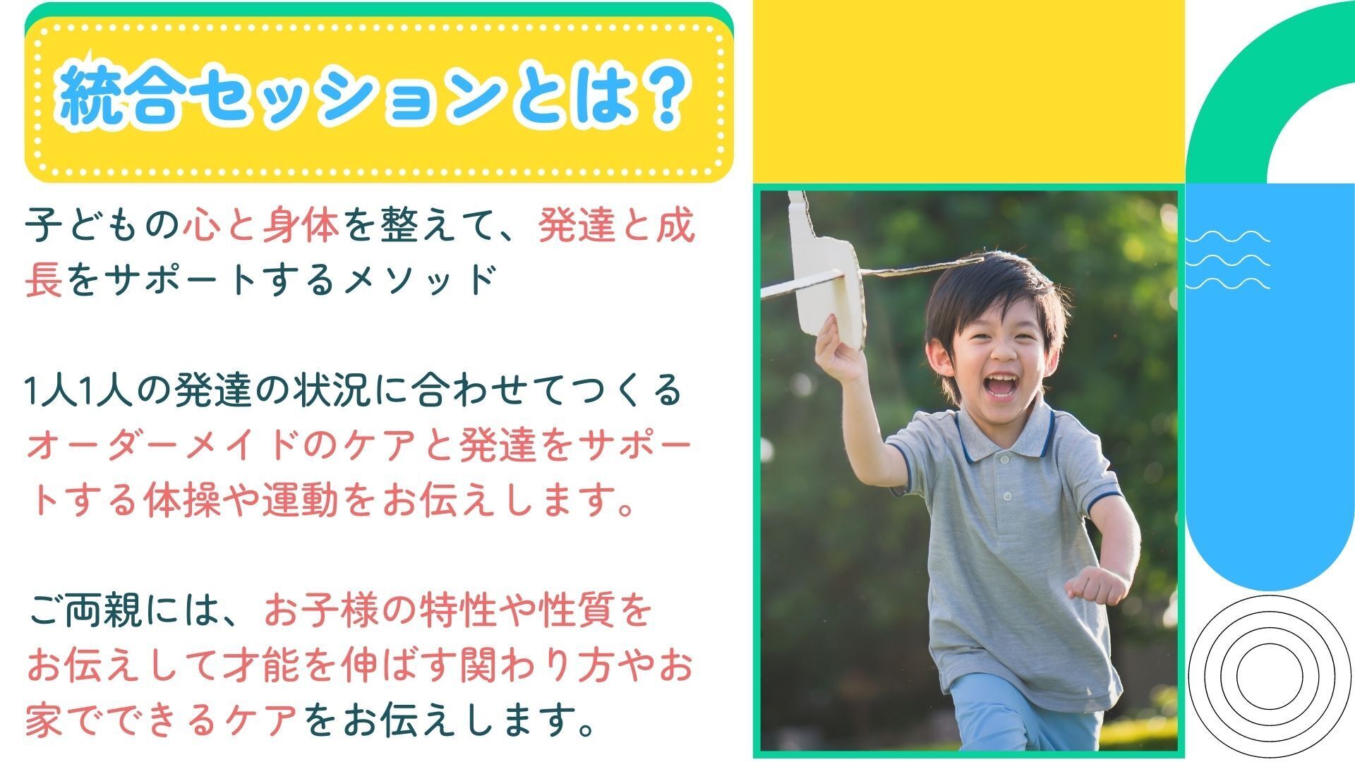 そんな発達や成長に課題や困難がある子の心と身体を整える統合セッションを通して、1人でも多くの子どもたちの個性や魅力を発見して才能を伸ばすためのお手伝いをしていきます。