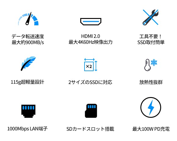 A:900MB/s転送速度を実現するためには高速読み書きに対応しているSSDをご利用ください。ハブのほか、データ転送速度はUSBメモリやPCの性能にもよるので、データ転送速度が900M/sに達することができない場合がございます。予めご了承ください。