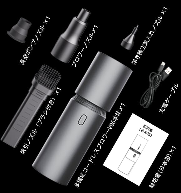 「V06」は掃除機、ブロワー、真空ポンプ、空気入れが1台になった多機能ブロワーです。吸込仕事率4100Paの強力な吸引力と1分間250リットルの強風で、一般の掃除機では届きにくい場所もきれいに掃除できます。