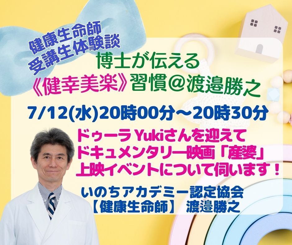 本日12日20時から配信する健幸美楽習慣のコツは7月30日(日)『産婆』&いのちの対話パネルディスカッションのパネラーである長田祐希先生(ドウーラ・健康生命師)をゲストにお招きして、5月6日に秋月養生処にお伺いしての体験談ならびに日頃のドウーラ の活動のお話などお伺いします。お楽しみに!「産婆 SANBA」には、生身の女性が命をかけて育み産んできたという歴史が記録されています。そして産婆が産婦さんや家族にずっと寄り添う偉大な存在であることも。日本には赤ちゃんの歳を胎内にいるときから数える数え歳の習慣がありますよね?赤ちゃんも無力な存在ではなく、すべて承知の上で自発的に生まれてくる驚きのチカラを持っています。この作品を観ることできっと“いのちの輝き”を眩しく感じられることでしょう。お産婆さんという存在がつい数十年前までは身近にいらして、自宅での出産も当たり前に行われていました。なのに、わたしは自分のお産の時に助産院で産むという選択をしませんでした。それは産婆(助産師)さんの存在も、母子共に健康なら助産院で産めることすら当時知らなかったからです。こんなエピソードがあります。大航海時代、大きな船に乗って 未開の土地に着いた船の船長が、原住民と身振り手振りでコミュニケーションしたとき、原住民が「どうやってここまで来たのか?」と尋ね、それに対して 船長が「あの船だよ」と指差しても原住民にはそれが認識できがなかった、実際 見えなかったというもの。原住民がその船に近づいていって、実際に触れてからようやく見えるようになったそうなんです。このエピソードから、人は視覚を通じて見たい物を見ている、という現実を示しているそうなんです。言い換えると、視覚とは、慣れ親しんだ見方で世界をとらえようとする感覚。つまり、慣れ親しんでいないとそこにあっても見えないものなんだそうです。 お産も同じですね。辛く 苦しいものとレッテル貼りをされ、そういうシーンに視覚で慣れ親しんでいたら、その見方にとらわれるということになります。現在 出産はほぼ医療機関で行われていますが、助産師さんや家族に見守られての出産もわずかながら残されています。女性には 誰と、どこで、どんな状況で産むかを選択する権利があります。信友先生とお母様、赤ちゃんの強力に引き合う信頼関係は安心と自信となって その後の子育てにもプラスの働きをします。ぜひ会場とオンラインで鑑賞いただき 感想をお聞かせください。7月30日(日)『産婆』&いのちの対話パネルディスカッションは信友智子先生(開業助産師)信友浩一先生(九州大学名誉教授・医師)岡田朱民先生(仏教大学看護学部講師)永露江未子先生(整体師・絵本作家)長田祐希先生(ドウーラ)をパネリストとして 京都二条駅前の仏教大学看護学部 キャンパスで13~17時に開催します!渡邉勝之(いのちアカデミー認定協会・ 健康生命師・鍼灸学博士)と早瀬麻子(仏教大学看護学部講師・助産師) が、司会進行します。リアル参加とオンライン参加の ハイブリッド形式です。 お陰様で現時点で30名以上の方々からのお申込みを頂いております!下記のキャンプファイヤーに詳細な内容をご案内しているので覗いて見てくださいね! ↓https://qr.paps.jp/LXoUh6月26日(月)20時~21:15第1回健幸美楽【L&L】オンラインラボを開催しました!多くの方々にご参加頂き、感謝・感謝です!!毎月第4月曜日20~21時に開催します。有料級のアーカイブ300本が見放題の会員サイトにもご招待致します。まだ、参加登録されていない方は下記のキャンプファイヤーのコミュニティーからどうぞ!(初月無料キャンペーン実施中です!) ↓https://community.camp-fire.jp/projects/view/677090“健幸美楽”Ⓡ習慣のコツ (毎週水曜日20時~20:30) &健幸美楽マイスターPR(毎週金曜日20時~21時) は下記のFBグループに配信しています。 ↓https://www.facebook.com/groups/574631280940750参加型のライブにしたいので、質問や疑問点などどしどしコメントしてくださいね。アーカイブをご視聴の皆さんも、コメントして頂くと次回のライブ時に回答させて頂きます!毎週水・金曜日20時に、お逢いできることを楽しみにしております。***プロフィール***渡邉 勝之(Watanabe Katsuyuki)です。・ いのちアカデミー認定協会代表 【健康生命師】 (博士)・ 1990年 大学・大学院教員 2006年 博士【鍼灸学】 著書・原論3部作 3冊出版 『医療原論』(紙出版&電子出版) 『医学&医療原論』 『医学・看護・福祉原論』(紙出版&Kindle出版) 『汝自身を知れ』(Kindle出版) 『博士が教える最強の健康メソッド』 (Kindle&オンデマンド版)・ 2018年 一般社団法人いのちクリエイション代表理事 いのちアカデミー【総長】 鍼灸 瑛 嵯峨嵐山 【院長】 いのち研究所 【所長】・ 2022年 いのちアカデミー認定協会Ⓡ 【健康生命師】Ⓡ__________________いのちアカデミー認定協会代表 【健康生命師】 渡邉勝之#健康生命師#いのちアカデミー認定協会#健幸美楽