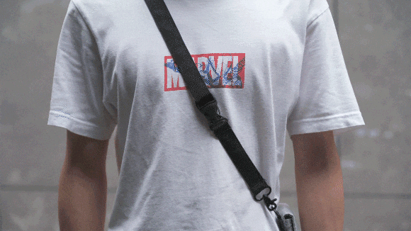 ベルトの長さはアジャスターで楽々調整できます。首に下げてから、ちょうどよい位置まで長さを縮めることも簡単です。長さを縮めると二つ折りに収まり、残った部分が邪魔になることはありません。