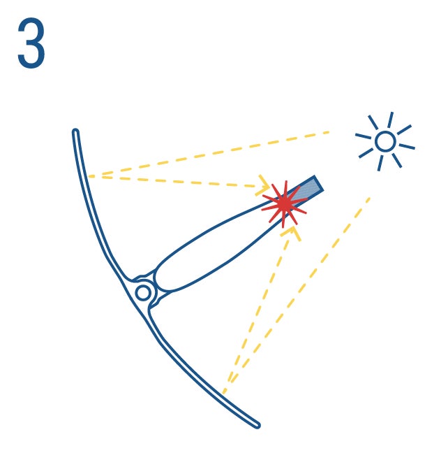 →枝、お香、新聞紙、タバコなど焦点を合わせてから約3秒で煙がたち始め、約10秒焦点を当て続けると火種として安定します。 太陽光が反射してしまう白い紙などでは火がつきません