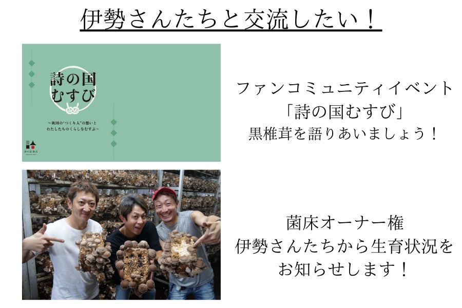 詩の国秋田㈱が主催する”生産者と消費者をつなぐ"ファンコミュニティイベント「詩の国むすび」にご招待。今回は、レンチナス奥羽伊勢をゲストに黒椎茸の魅力について語り合います。