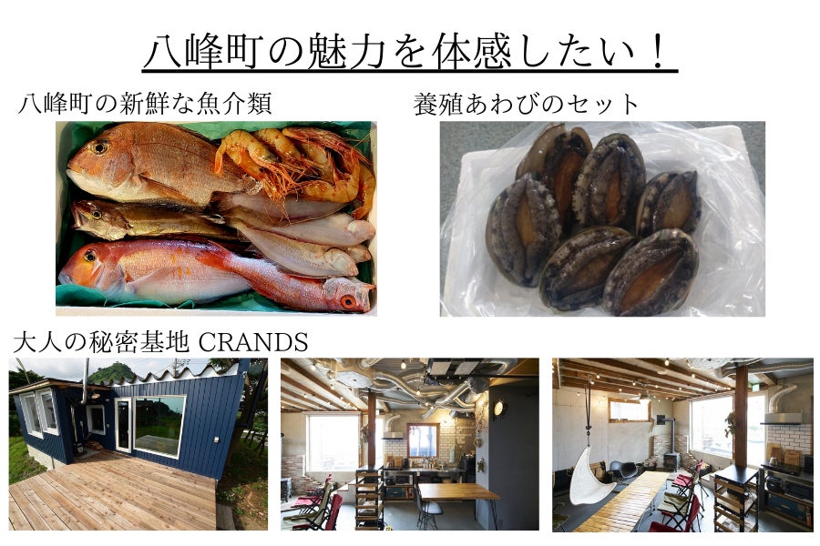 漁業も盛んな八峰町の若手漁師グループ「fish door」がお届けする新鮮魚介類セットや1日1組限定の”泊まれる大人の秘密基地”CRANDSで使えるクーポン券、八峰町の「大森グループ」が手掛ける養殖あわびとのセットなど八峰町の魅力を味わえる黒椎茸とのコラボセットをお届けします。