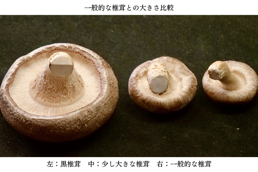 「焼き椎茸に適した美味しい椎茸=肉厚で大きな椎茸」というイメージはあったものの、実現するのは難しかったそうです。椎茸を大きく栽培することはできても、傘の部分が横に広がり薄っぺらい椎茸になってしまうなど、思い描いた椎茸の姿にはなかなかたどり着くことができませんでした。それでも、水分量の微妙な調節や栽培手法の見直しなど様々な試行錯誤を繰り返し、約2年の歳月を経てようやく理想とする美味しい椎茸「黒椎茸」にたどり着きました!
