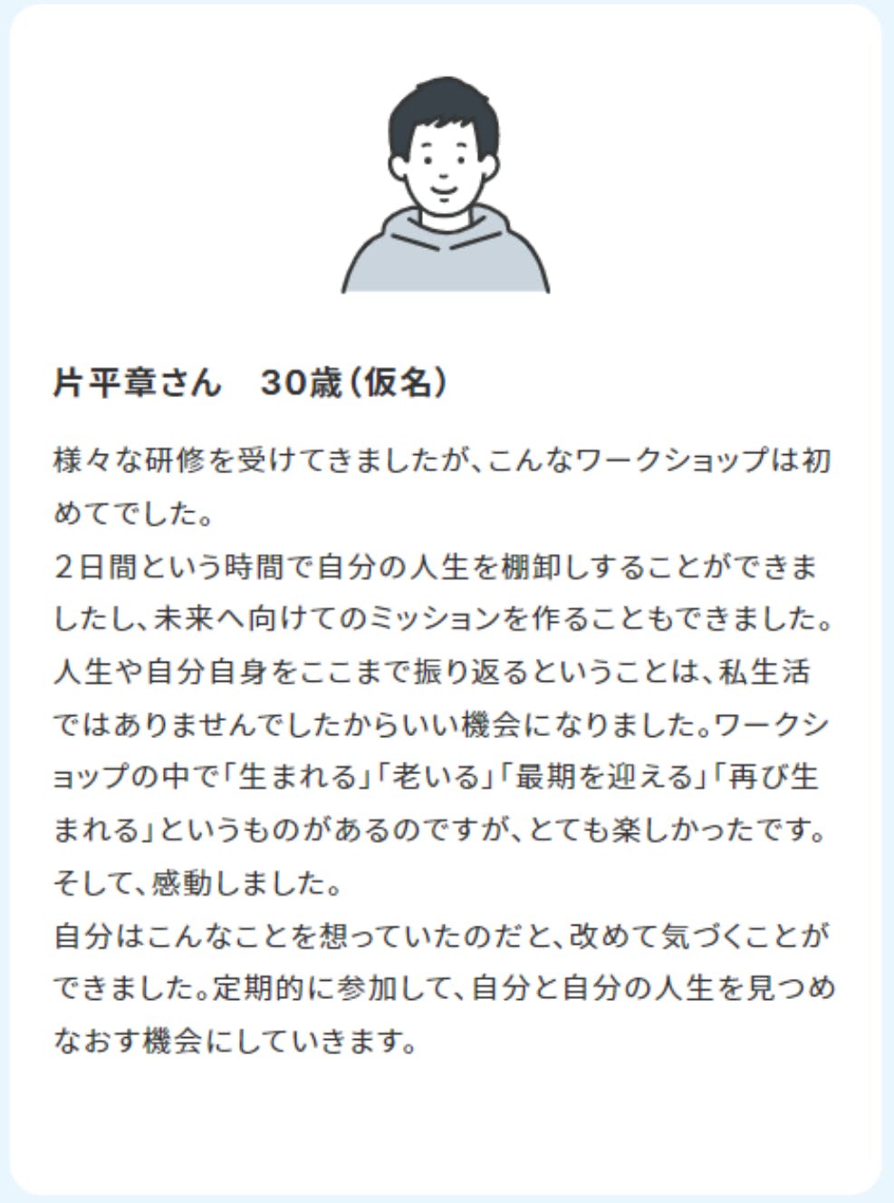これまでの人生を振り返りつつ、「生まれてから老いて最期を迎える」までを疑似体験。模擬のお葬式を経て生まれ変わり、新しい一歩を踏み出します。今までの人生を一回リセットして、新しい人生を歩み始めるワークショップです。