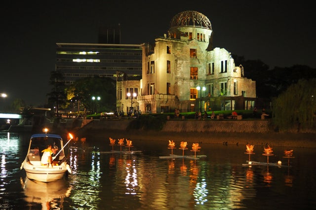 原爆ドーム前の元安川に浮かび上がる「かがり灯」の炎を眺めていると、自然に祈りの想いが湧きあがります。