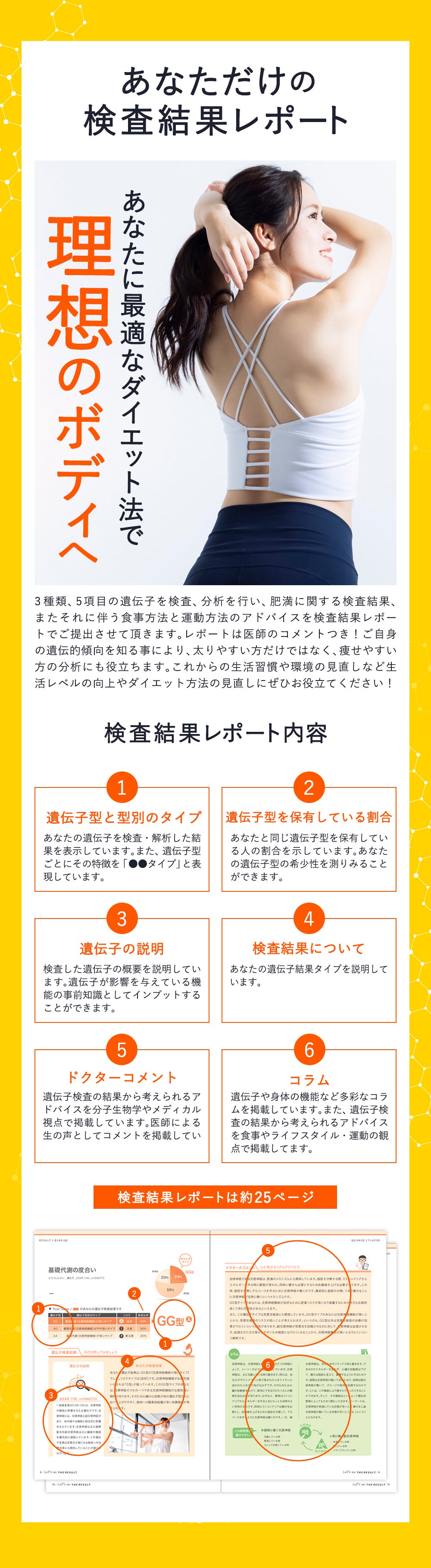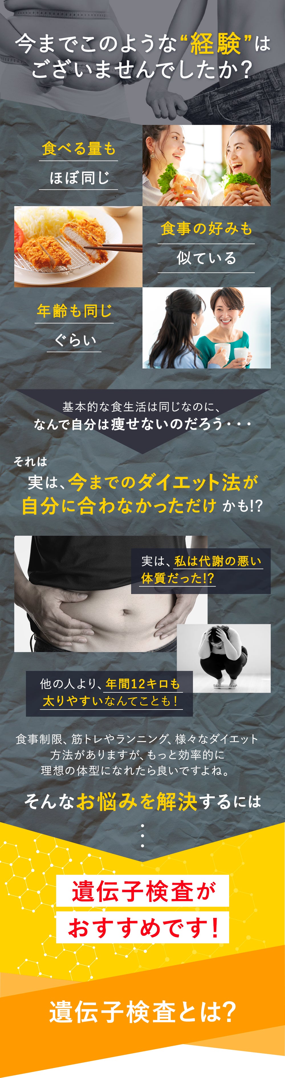 - ❶ 自分だけのダイエット方法で理想の体型へ!遺伝で太りやすさは大きく変わる!肥満遺伝子検査キット!