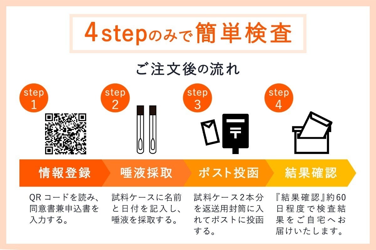 ❸ 検査は精度の高いダイレクトシークエンス法を採用!唾液を採取して送るだけ!4Stepの簡単検査!