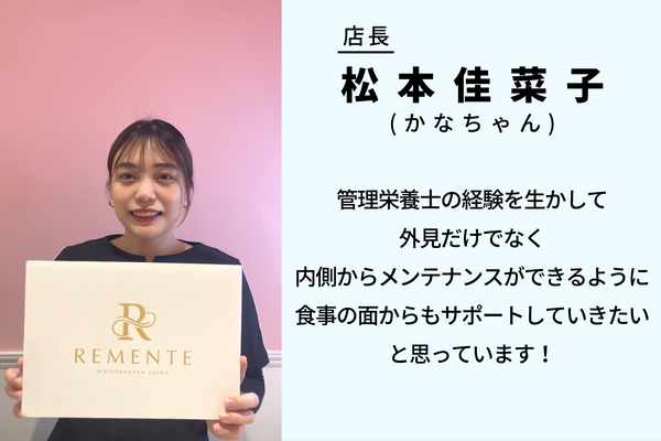REMENTEのメニューで顔のお手入れが出来るだけでなく、管理栄養士でもあるスタッフが、体の中から調子を整えて美しくなるインナービューティについても一緒に考えてまいります!店舗でみなさんにお会いできるのを楽しみにしております!