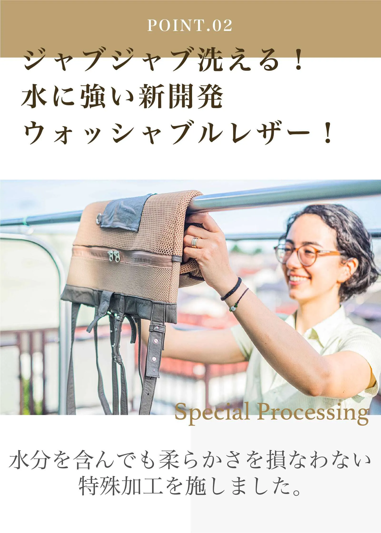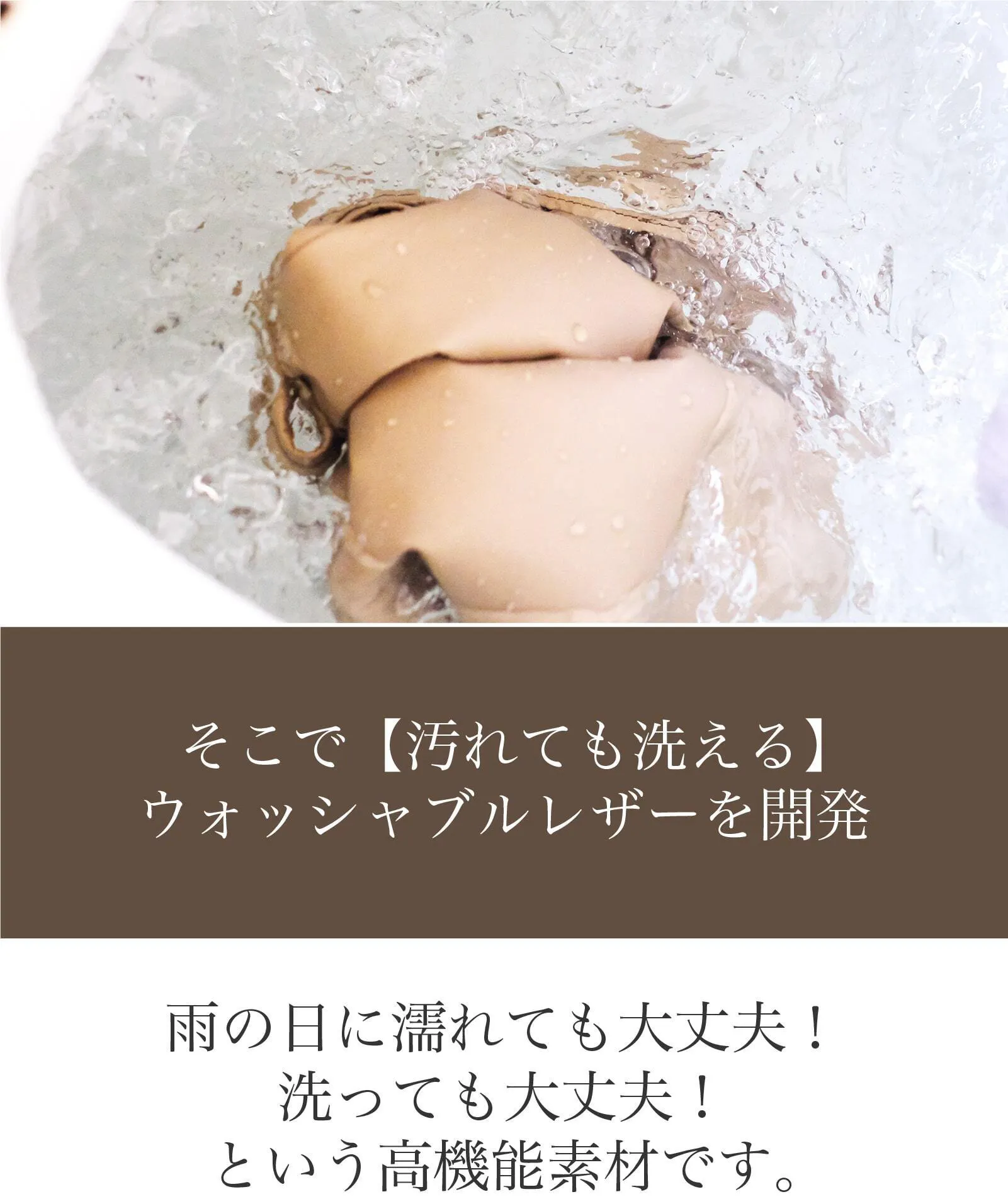 素材からこだわった特別なウォッシャブルレザーを開発することで汚れても洗える!