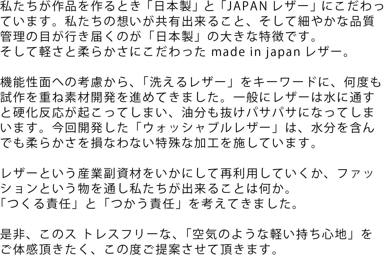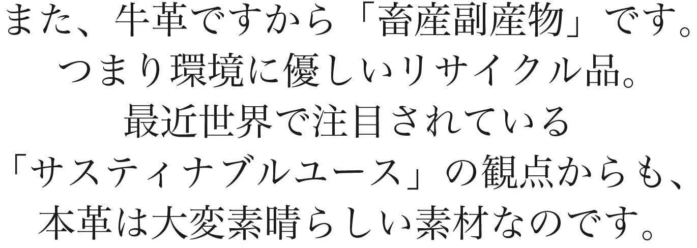 今回のウォッシャブルレザーは当然、本革(リアルレザー)を使用。天然のものですので、手入れ次第では10年以上もお使い頂けます。また、牛革ですから「畜産副産物」です。つまり環境に優しいリサイクル品。最近世界で注目されている「サスティナブルユース」の観点からも、本革は大変素晴らしい素材なのです。